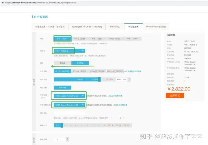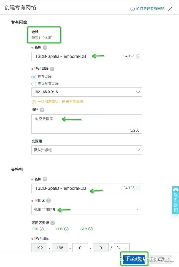 以“华北1(杭州)”区为例,选择地域:华东1(杭州),交换机选项中,选择需要的可用区如“杭州 可用区B”, 后续创建时空数据库实例,会用到 “地域” 、“可用区”、“VPC”、“交换机” 这几个概念。