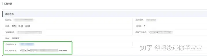 ACTION4: 在“实例详情”页面中,查看“公共网络地址” 和 “VPC网络地址”,设置网络白名单。