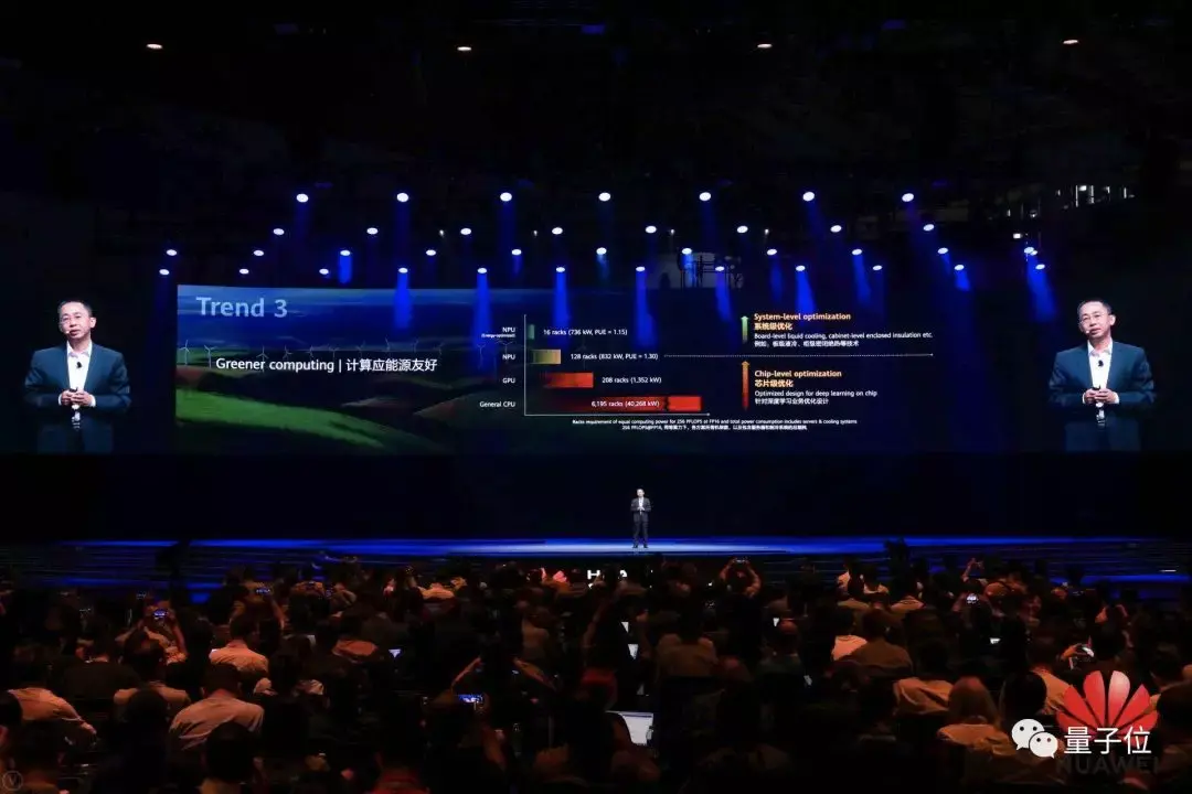 要实现这样的算力,如果用CPU需要6195个机柜, 用GPU需要208个机柜,而NPU如昇腾只要128个机柜。
