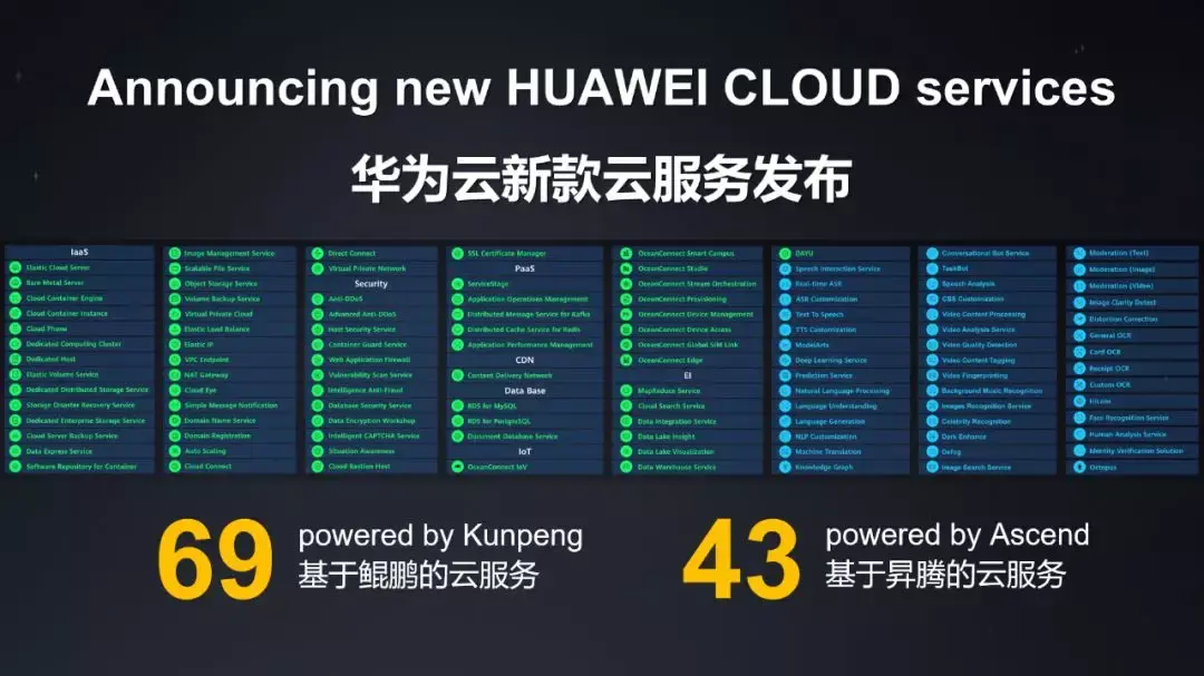 此外,华为也发布了112款基于鲲鹏和昇腾的云服务,包括69款基于鲲 鹏的云服务和43款基于昇腾的云服务,让客户和合作伙伴们能 更容易的获取鲲鹏和昇腾的算力。