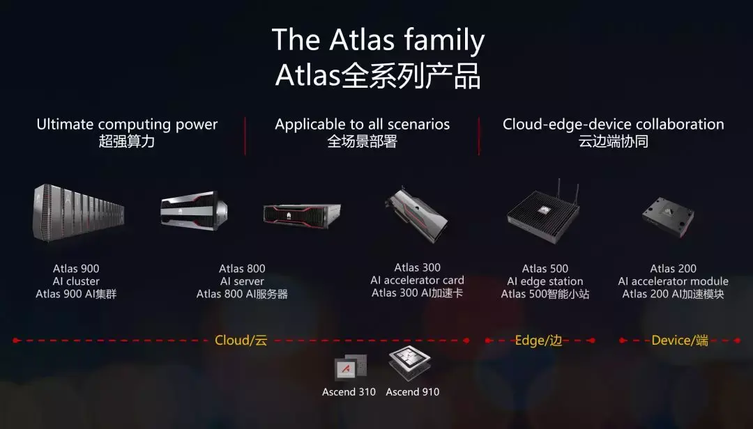 而且相比Atlas(古希腊神话里的“大力神”),实际不到三年时间里,华为已经发布了10款商用芯片: