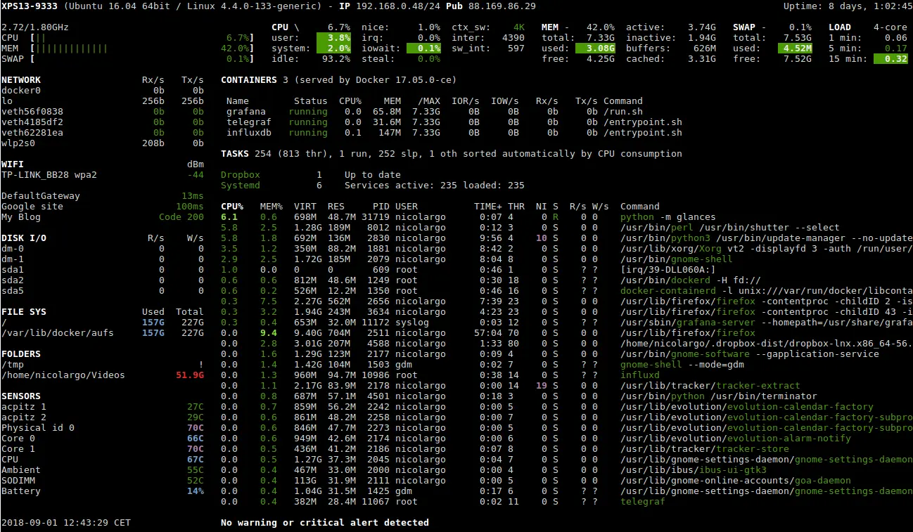Glances 是一个用于监控系统的跨平台、基于文本模式的命令行工具。它是用 Python 编写的,使用 psutil 库从系统获取信息。你可以用它来监控 CPU、平均负载、内存、网络接口、磁盘 I/O,文件系统空间利用率、挂载的设备、所有活动进程以及消耗资源最多的进程。信息比 htop 更加丰富,除了命令行,Glances 还提供页面服务,可以让你从页面上随时查看某服务器的状态。