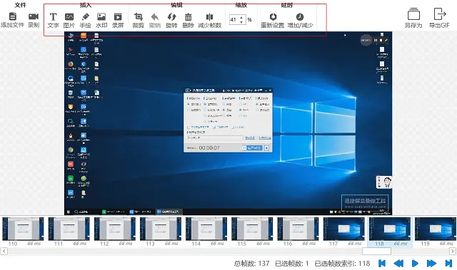 5、如果你还想对这个GIF进行编辑的话,可以到页面上方选择编辑工具。里面有添加图片、文字工具,有裁剪、旋转、减少帧数的工具,还有缩放、延时的工具。