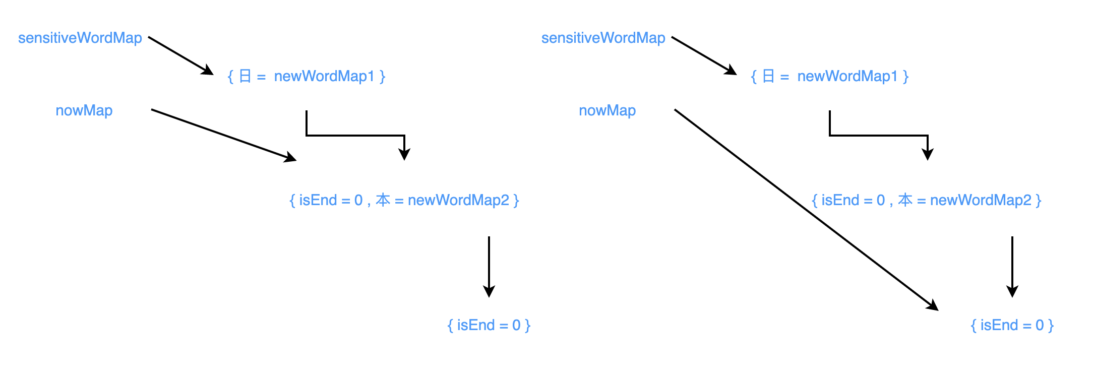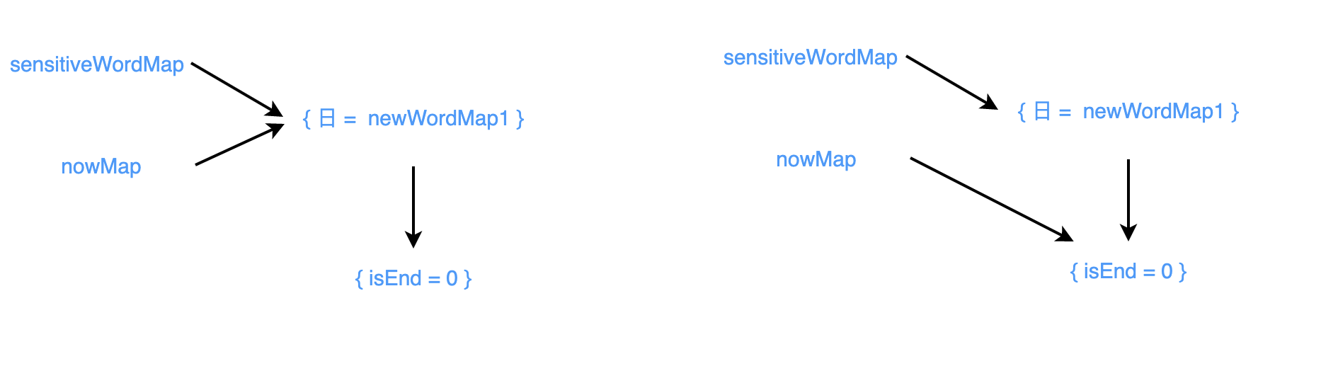 - sensitiveWordMap 和 nowMap 指向同一个对象,nowMap 而后改成指向与 newWordMap1 同一个对象