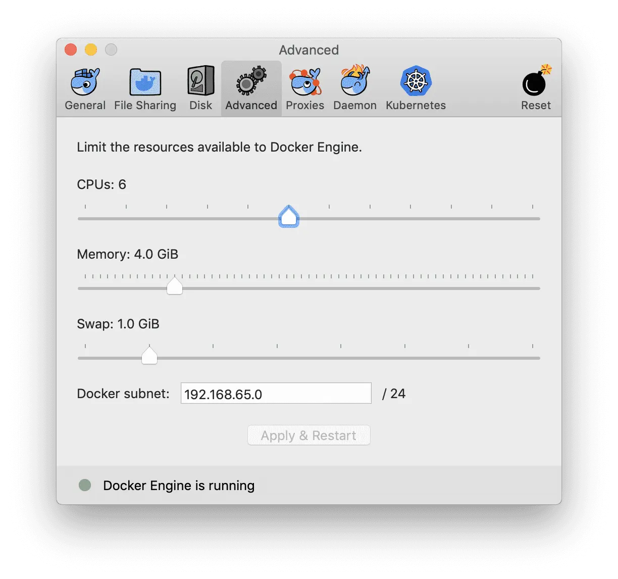 注意:Docker 默认配置的资源可能不太够,会导致运行 Flink Job 时卡死。因此推荐配置 Docker 资源到 3-4 GB,3-4 CPUs。