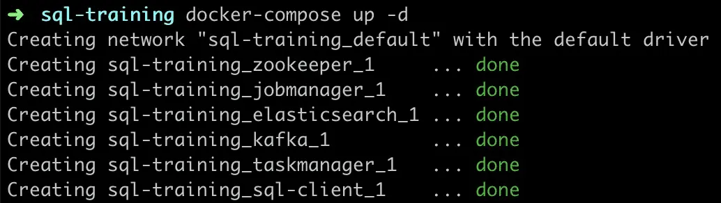 docker-compose 命令会启动所有所需的容器。第一次运行的时候,Docker 会自动地从 Docker Hub 下载镜像,这可能会需要一段时间(将近 2.3GB)。之后运行的话,几秒钟就能启动起来了。运行成功的话,会在命令行中看到以下输出,并且也可以在 http://localhost:8081 访问到 Flink Web UI。