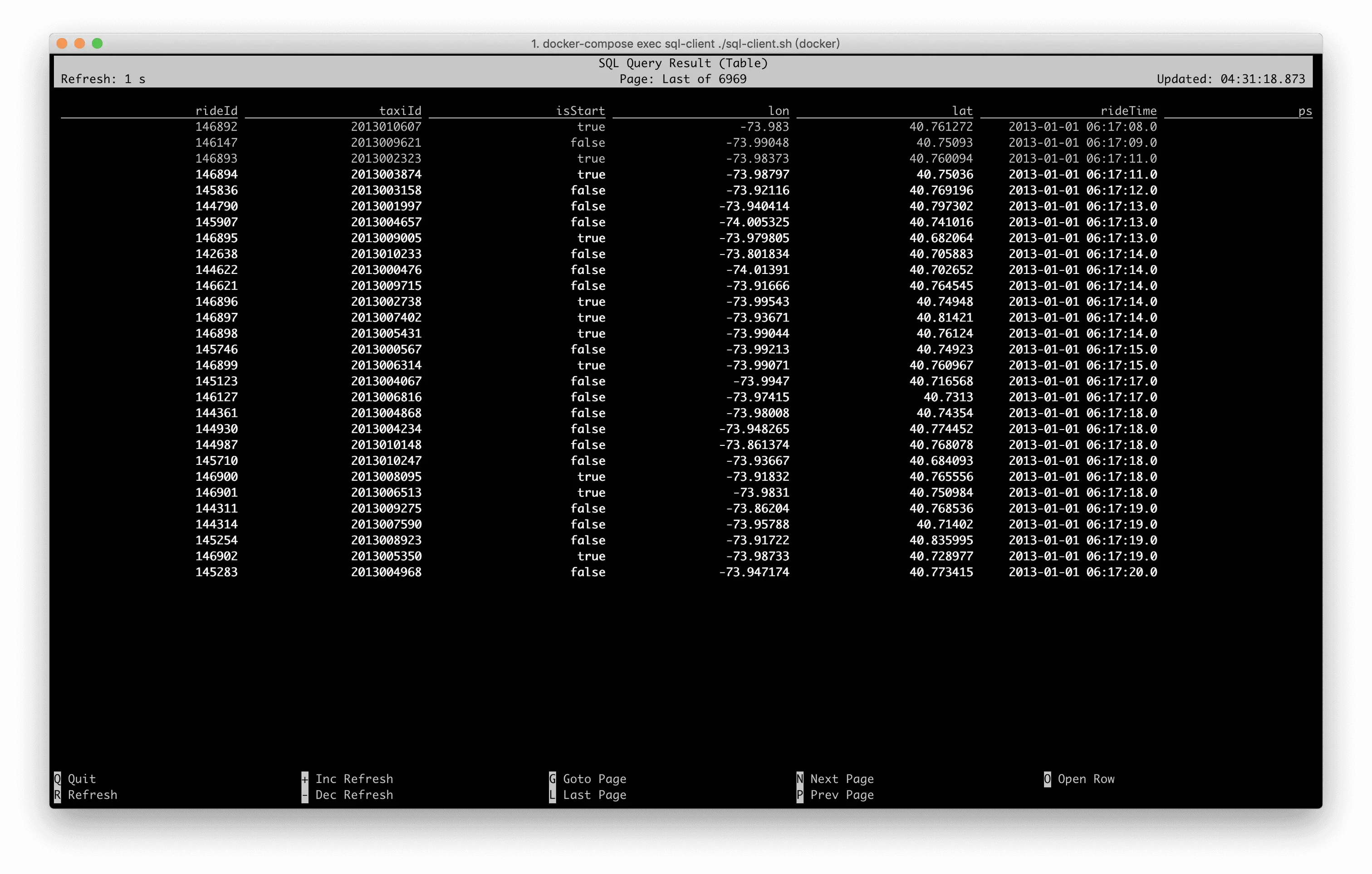 SQL CLI 便会提交一个 SQL 任务到 Docker 集群中,从数据源(Rides 流存储在Kafka中)不断拉取数据,并通过 isInNYC 过滤出所需的数据。SQL CLI 也会进入可视化模式,并不断刷新展示过滤后的结果: