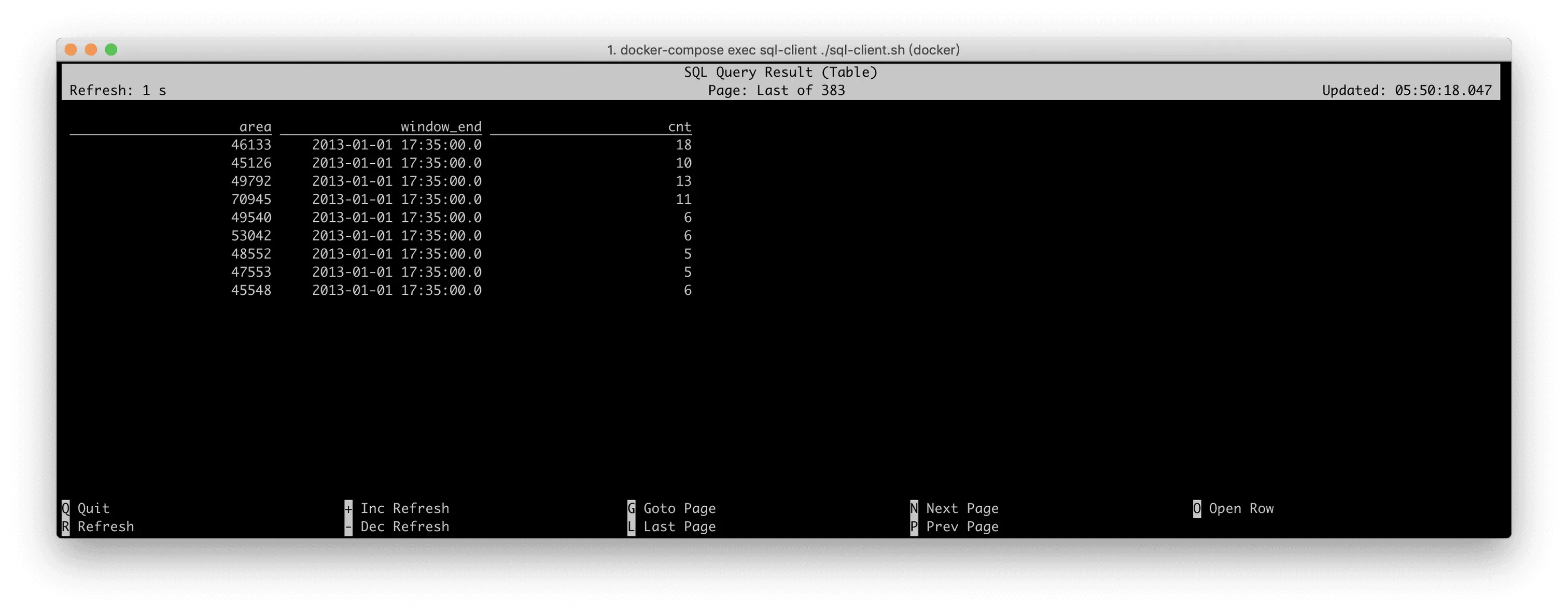 在 SQL CLI 中运行后,其可视化结果如下所示,每个 area + window_end 的结果输出后就不会再发生变化,但是会每隔 5 分钟会输出一批新窗口的结果。因为 Docker 环境中的source我们做了10倍的加速读取(相对于原始速度),所以演示的时候,大概每隔30秒就会输出一批新窗口。