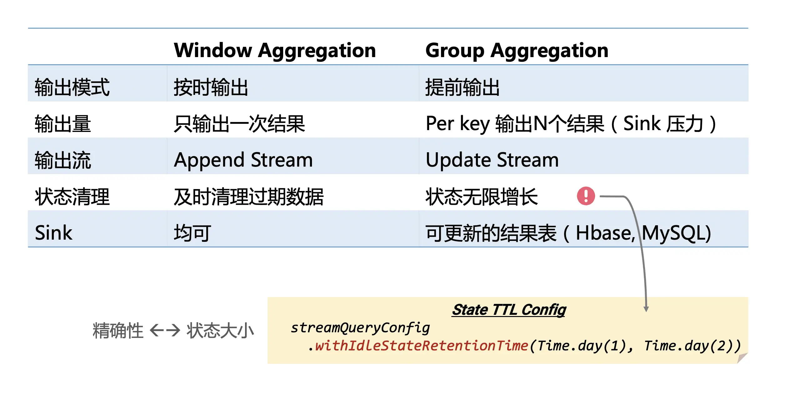 另外一个区别是,window 由于有 watermark ,可以精确知道哪些窗口已经过期了,所以可以及时清理过期状态,保证状态维持在稳定的大小。而 Group Aggregate 因为不知道哪些数据是过期的,所以状态会无限增长,这对于生产作业来说不是很稳定,所以建议对 Group Aggregate 的作业配上 State TTL 的配置。