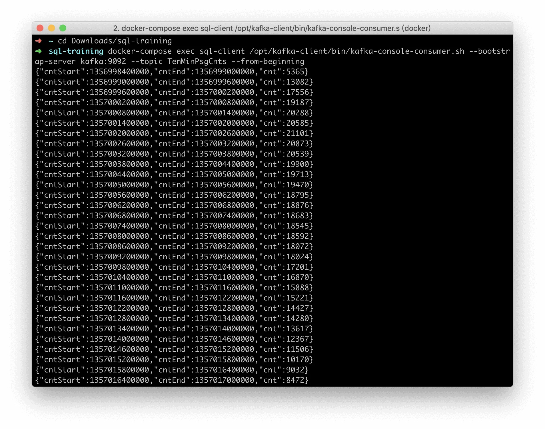 docker-compose exec sql-client /opt/kafka-client/bin/kafka-console-consumer.sh --bootstrap-server kafka:9092 --topic TenMinPsgCnts --from-beginning