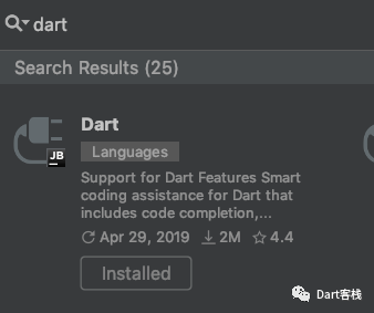 在弹出的界面中输入dart即可找到插件,然后就是安装了,我这里已经安装了,小伙伴可以点击之后等待一段时间,重启即可