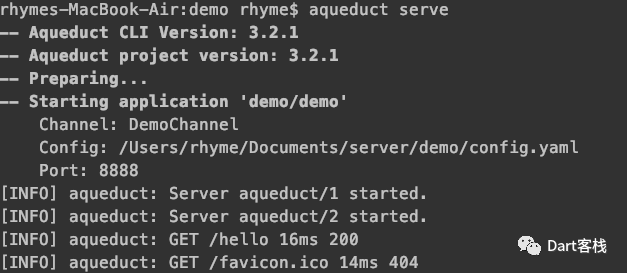 现在我们可以输入aqueduct serve启动服务器,然后访问http://localhost:8888/hello即可
