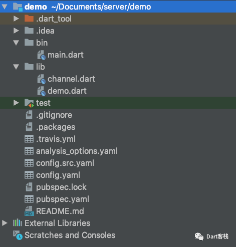 1 各文件介绍 2-| demo 3-| .dart_tool 自动生成的文件 4-| .idea 编译工具自动生成 5-| bin 6 -| main.dart 程序入口 7-| lib 8 -| channel.dart 通道 9 -| demo.dart 用于导包10-| test 编写测试用例11-| .gitignore git忽略文件用12-| .packages 运行pub get 会自动生成13-| .travis.yml 持续集成相关14-| analysis_options.yaml 静态分析相关15-| config.src.yaml 开发环境下的配置16-| config.yaml 正式环境下的配置17-| pubspec.lock 运行pub get 会自动生成18-| pubspec.yaml 程序的描述及依赖的插件包声明19-| README.md Aqueduct的简单使用介绍