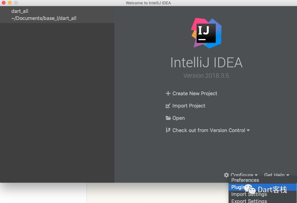 配置编译工具我们一般以IDEA编程工具打开项目,在打开之前,我们需要添加 Dart开发插件,打开IDEA,然后选择 configure,找到Plugins