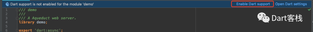 然后我们可以选择Open,选中上一节中创建的 Aqueduct项目,打开之后可以先看看,当点击一个dart文件时,会出现下面的一个提示,我们选中Enable Dart support即可