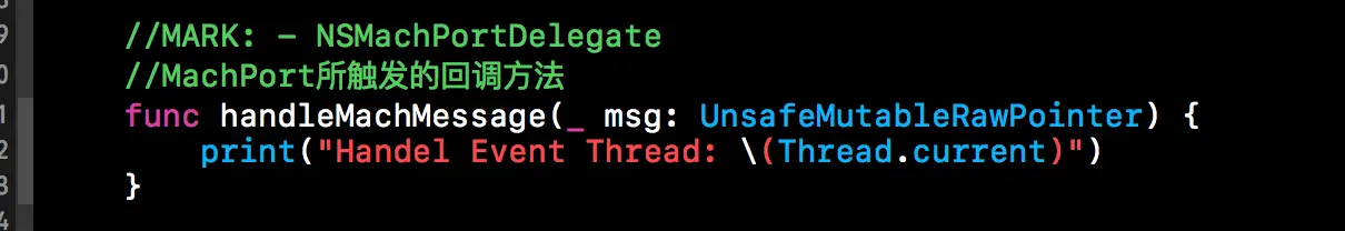 接下来我们就通过一个小的示例来简单的看一下MachPort的使用方式。首先我们声明了一个NSMachPort的成员属性handelEventMachPort,该变量实例化后指定其NSMachPortDelegate的对象为当前类。然后将handelEventMachPort添加到主线程中,具体代码如下所示。