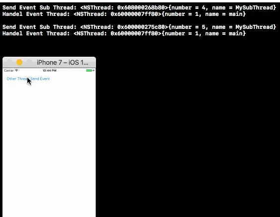 代码实现完毕后,接下来就该看一下运行效果了。下方就是上述代码示例所运行的结果。从结果中我们不难看出,点击按钮时,会开启一个新的子线程,我们将这个开启的子线程命名为“MySubThread”。在这个子线程中我们调用了与主线程关联的MachPort对象发送消息。然后在主线程中执行该MachPort对象的相关回调方法,每次点击按钮的输出如下所示: