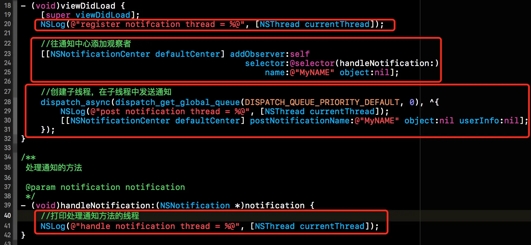 下方就是本部分的核心代码,代码比较简单。首先我们打印出注册观察者的线程,然后往通知中心添加观察者。紧接着我们就创建一个子线程,然后对子线程的信息进行打印并获取通知中心单例发送通知。