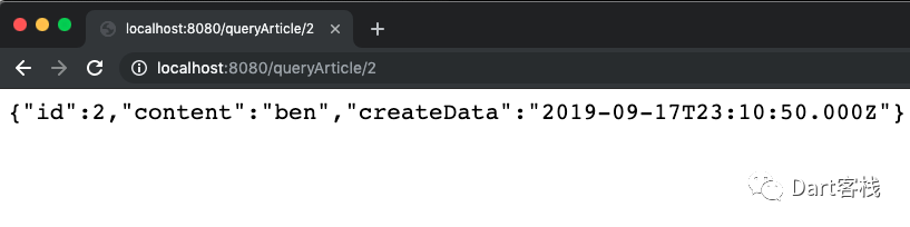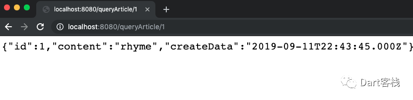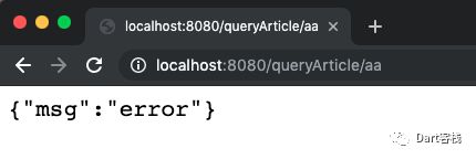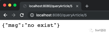 1 @override 2 Controller get entryPoint { 3 //可选变量[:id] 4 router.route('/queryArticle/[:id]').linkFunction((request) async { 5 final id = request.path.variables['id']; 6 if(id==null){ 7 final query = Query<Article>(context); 8 final List<Article> articles = await query.fetch(); 9 return Response.ok(articles);10 }else if (int.tryParse(id) != null) {11 final query = Query<Article>(context)12 ..where((a) => a.id).equalTo(int.parse(id));13 final articles = await query.fetchOne();14 if(articles!=null){15 return Response.ok(articles);16 }else{17 return Response.ok({"msg":"no exist"});18 }19 }else{20 return Response.badRequest(body:{"msg":"error"});21 }22 });23 return router;24 }