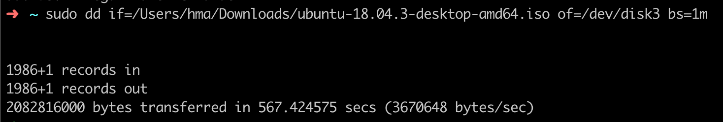sudo dd if=/Users/hma/Downloads/ubuntu-18.04.3-desktop-amd64.iso of=/dev/disk3 bs=1m结果: 这个过程有点长,需要几分钟