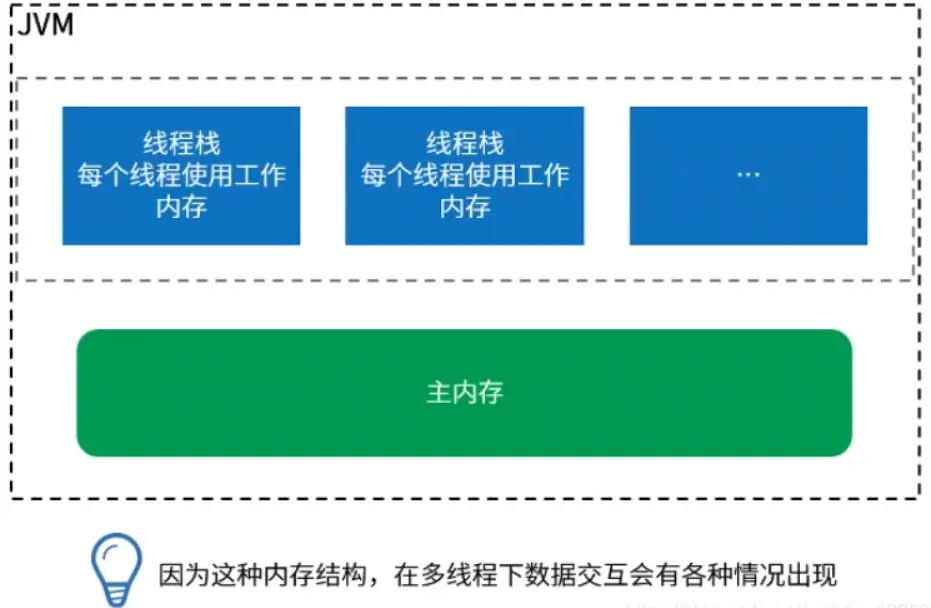 - 比如,每个线程都由自己私有的工作内存(线程栈内存),要想多线程之间进行数据交互就需要在共享内存或堆内存中进行访问。而这就需要一种规范,来规定每个操作。具体的内存模型的实现就需要不同平台的 JVM 的不同实现。
