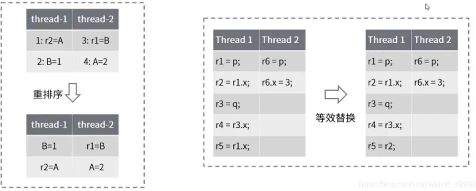 伪代码实例:r=new ReferenceObj();k=r.f;这两个操作不能重排序。
