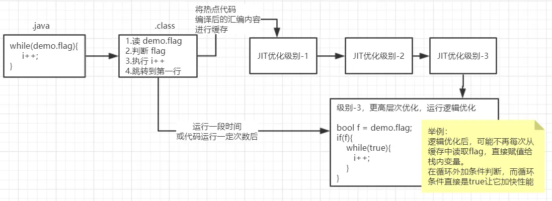 - 即时编译器(JIT compiler, just-in-time compiler),提供了代码优化机制,来提高 JVM 的性能。也正是由于开启了 JIT,使得 class 文件在运行成为汇编语言时进行指令重排。