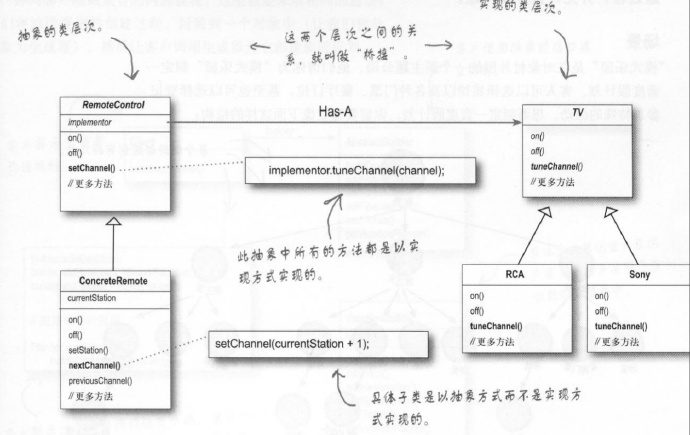 场景: 现在有一个接口友好的电视遥控器,你需要使用好的OO技能,让所有的遥控器基于相同的抽象,而对此抽象又做出许多不同的实现--每部不同型号的电视都有自己的遥控器实现。