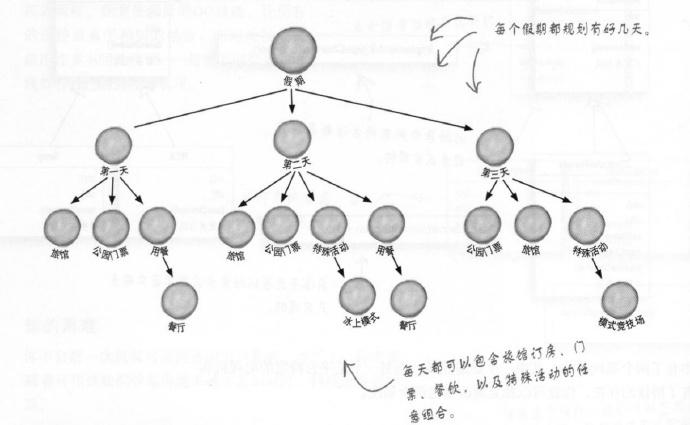 场景: 你家附近开了一个新主题乐园,他们邀请了一部分用户参与制定一套度假计划。客人可以选择旅馆以及各种门票、餐厅订位、甚至也可以选择登记参加特殊活动。想要制定一套度假计划,你需要建立如下这样的结构: