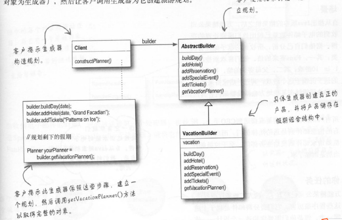 建造者模式助力: 学习过迭代器的同学还记得迭代器的方式吧。将迭代的过程封装入一个独立的对象中,并向客户隐藏集合的内部表现。在这里,我们也用相同的想法:把旅游规划的创建过程,封装到一个对象中(我们称此为生成器或建造者),然后让客户调用生成器为它创建规划。
