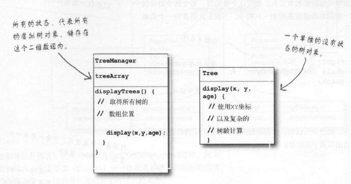 享元模式来助力: 遇到上面的问题,那我们可以重新设计系统,只要用一个树实例和一个客户对象来维护所有树的状态即可,这就是享元模式。