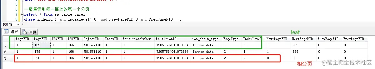 下一个章节会对索引分页详细说明,其中聚集索引叶级别,非聚集索引结点级不做细节介绍。