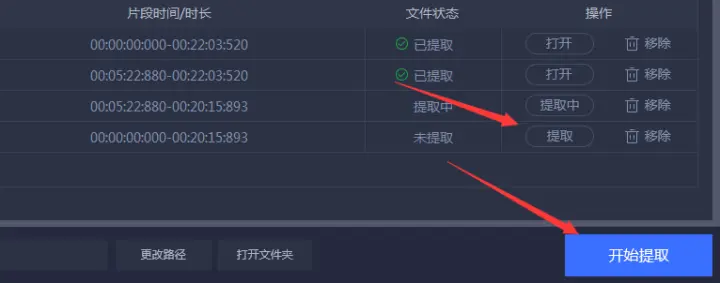 5、最后点击提取按钮就可以把你添加好的音频片段依次转换成mp3,也可以直接点击开始提取按钮同时转换音频片段。