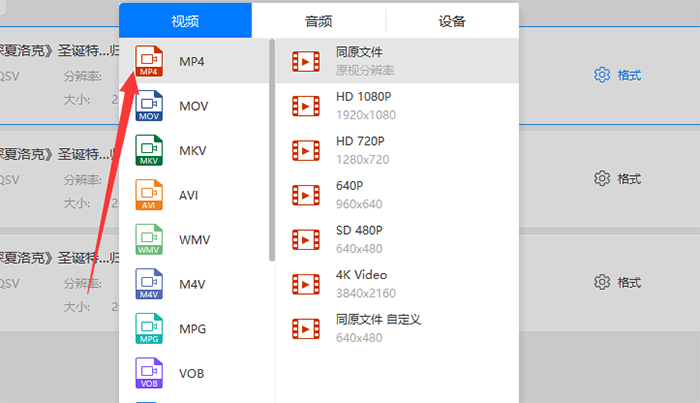 2、然后就是选择转换文件的格式了。软件默认转换成mp4视频格式,但是也是可以修改的,点击文件后面的“格式”然后在小窗口中选择视频的分辨率大小,视频格式也是可以随便选择的。