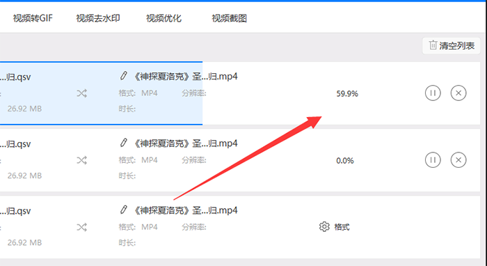 4、然后就是转换qsv视频格式了。这个软件可以有两个地方转换,点击全部转换按钮或者单独转换一个文件都是可以的。然后就需要等待转换完成就行了。