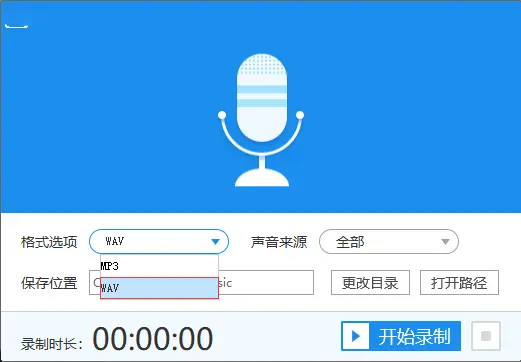 2、格式选择里面有MP3和WAV两种音频格式可以选择,对音质要求比较高的用户建议选择WAV格式(WAV是未经过压缩,音质方面不会出现失真)。
