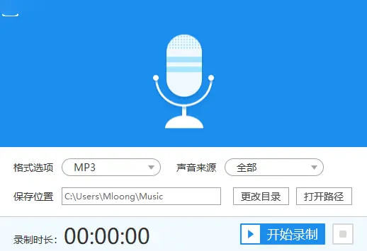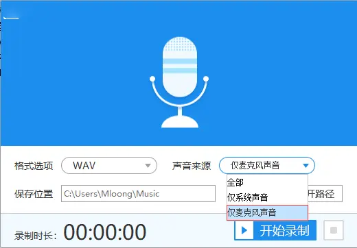 3、声音来源是用来选择录制模式的,有“全部”、“仅系统声音”和“仅麦克风声音”三种选择,选择“仅麦克风声音”来做演示例子。