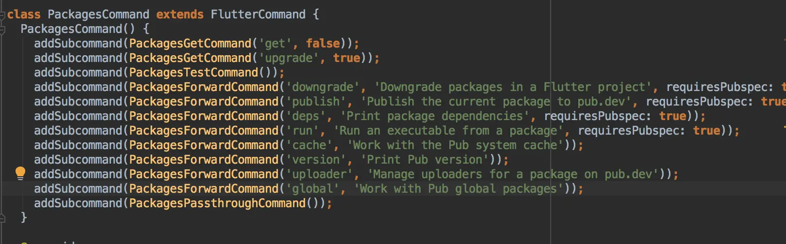 所以,所有的开始应该在 executeable.dart 里面;里面主要是把所有的命令都封装成一对象,然后放到一个数组里面注册,因为我们主要是观察 flutter packages get 这个命令,所以我们去看下 PackagesCommand