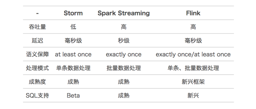 目前比较流行的实时处理引擎有 Storm,Spark Streaming,Flink。每个引擎都有各自的特点和应用场景。 下表是对这三个引擎的简单对比。