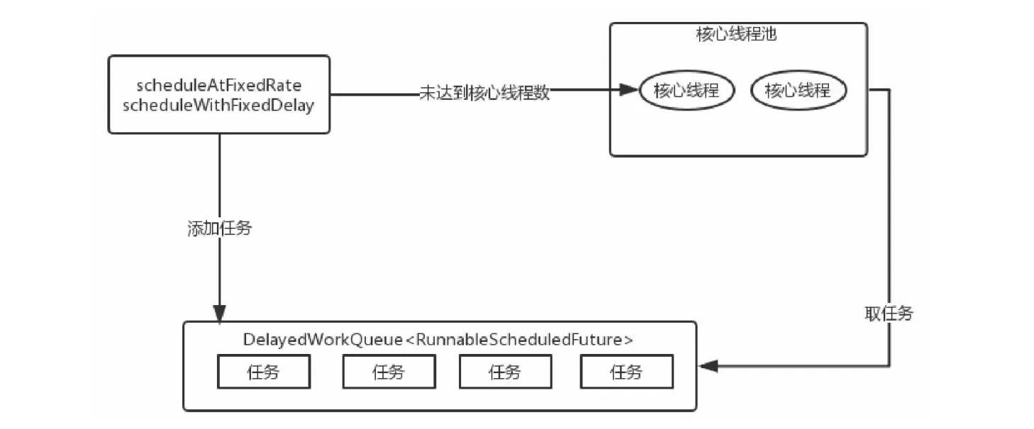 当执行ScheduledThreadPoolExecutor的scheduleAtFixedRate或scheduleWithFixedDelay方法,会向DelayedWorkQueue添加一个实现RunnableScheduledFuture接口的任务包装类ScheduledFutureTask,并检查运行的线程是否达到核心线程数corePoolSize。如果没有就新建线程,并启动。但并非立即执行任务,而是去DelayedWorkQueue中取任务包装类ScheduledFutureTask,然后再去执行任务; 如果运行的线程达到了corePoolSize,就把任务添加到任务队列DelayedWorkQueue中;DelayedWorkQueue会将任务排序,先执行的任务放在队列的前面。 任务执行完后,ScheduledFutureTask中的变量time改为下次要执行的时间,并放回到DelayedWorkQueue中。