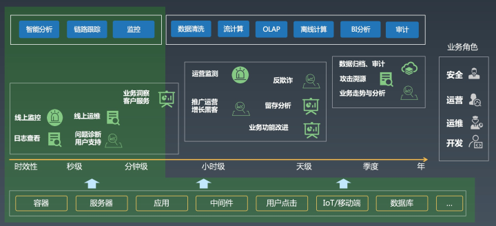 在阿里,几乎所有的业务角色都会涉及到各式各样的日志数据,为了支撑各类应用场景,我们开发了非常多的工具和功能:日志实时分析、链路追踪、监控、数据加工、流计算、离线计算、BI 系统、审计系统等等。日志系统主要专注于数据的实时采集、清洗、智能分析与监控以及对接各类各样的流计算、离线系统。