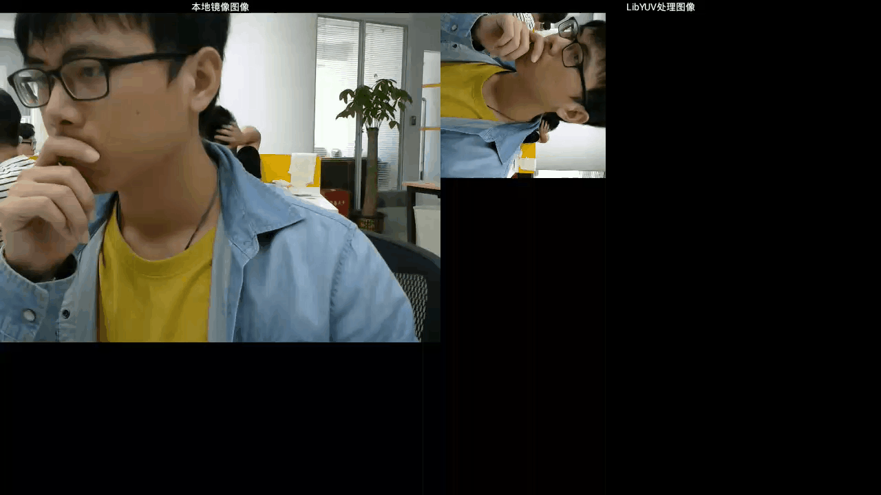 录制了一小段屏幕,左边是使用UVCCameraTextureView预览USB摄像头镜像后图像,右边是使用YuvUtil对yuv数据进行 镜像、旋转、缩放、裁剪 后的图像,分辨率640*480,流畅度还可以,是镜面效果,完美,撒花。