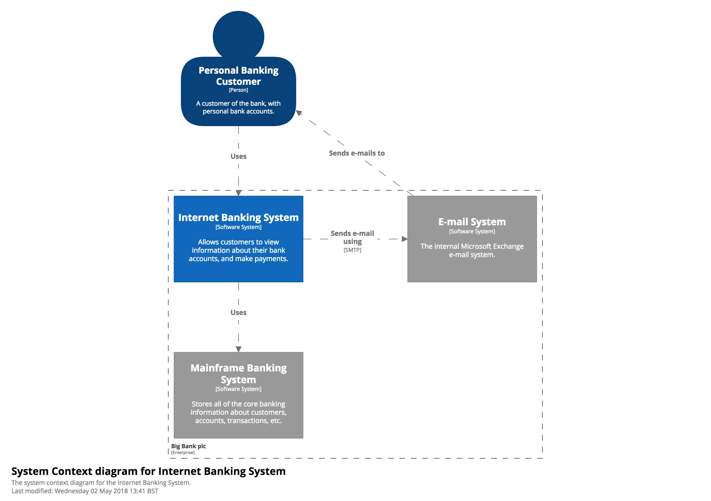 那么在系统上下文图里,方块指代的是软件系统,蓝色的表示我们聚焦的系统,也就是我开发的系统(也可能是我分析的系统,取决于我是谁),灰色表示我们直接依赖的系统,虚线框表示的是企业的边界。通过这些图形化的元素表达我们可以看出来各个系统彼此之间的关系。