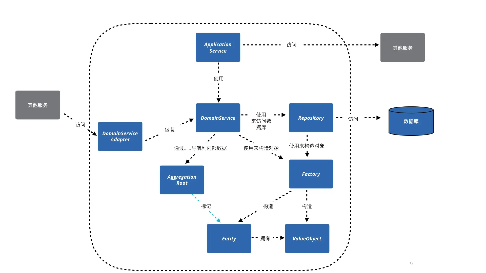 当我们放大一个容器,我们就会看到组件,如上图所示。组件在这里面很好的把接口和它的实现类打包成一个概念来表达关系。我个人觉得有时候一些存在于代码中,但又不是接口的某些东西,比如Service、Controller、Repository之类也可以用组件图来表达,如果你学了一些没有明确抽象层次的架构知识或者一些单体时代的遗留经验的时候,你可以画出来一些组件图,来印证自己的理解,如下图,我画的我对DDD战术设计里面的一些概念的理解: