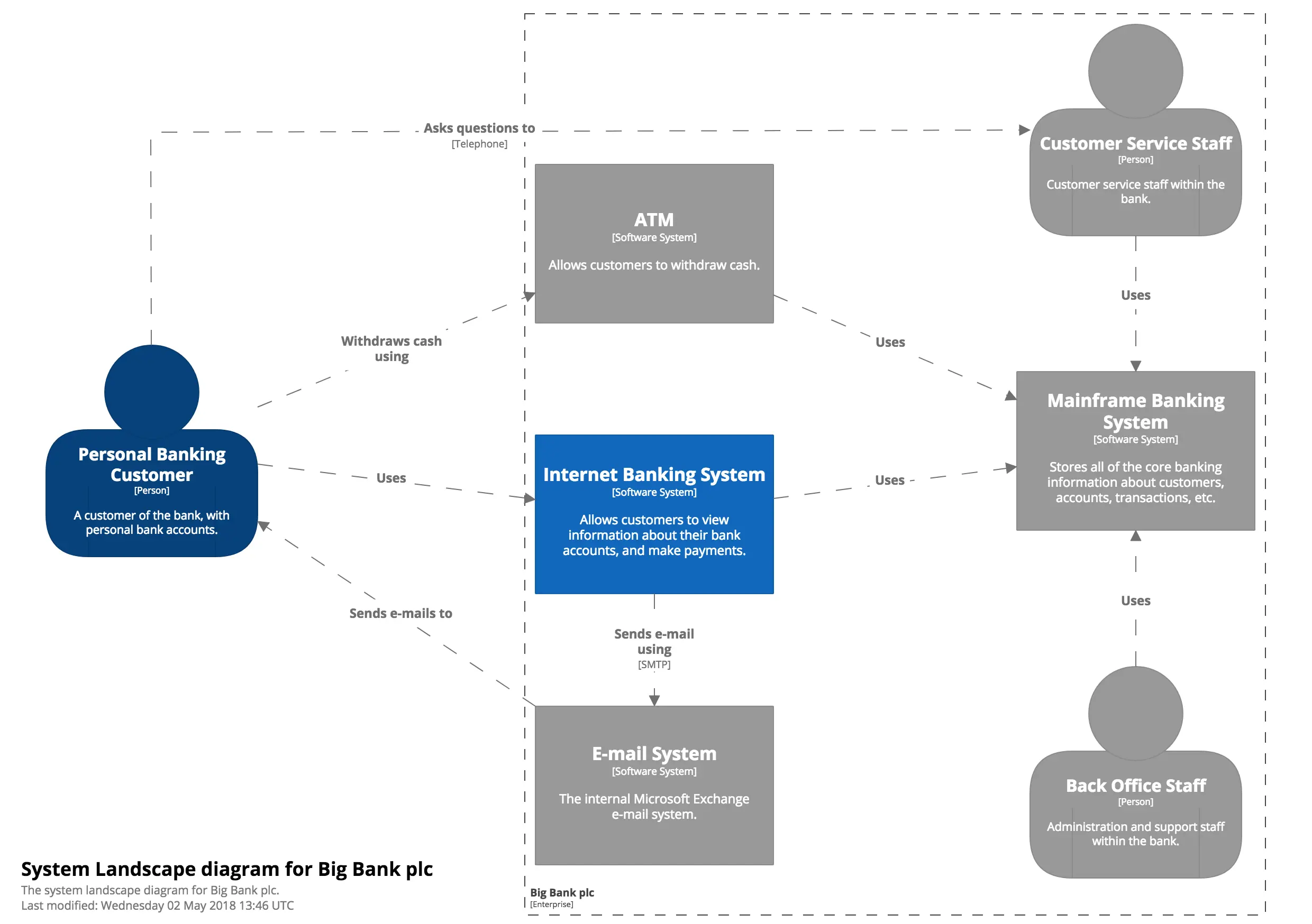 看得出来,系统景观图是比上下文图更丰富的系统级别的表达。不像上下文图只关注聚焦系统和它的直接关系,连一些间接相关的系统都会标示出来,那些系统的用户以及用户之间的关系也会标示出来,只是内部的用户会用灰色标记。
