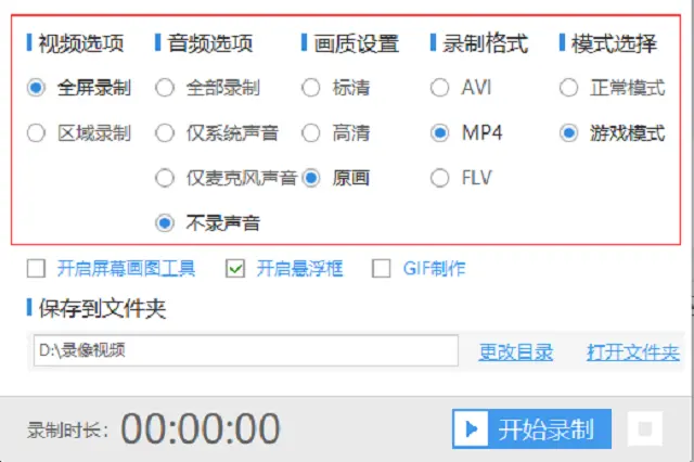 2、打开之后先设置一下录制的参数,有视频、音频、画质、格式和模式。其中视频选择全屏录制、音频选择录全部声音、画质选择原画、格式的话在AVI、MP4、FLV中随便选择一个,模式的话选择游戏模式。