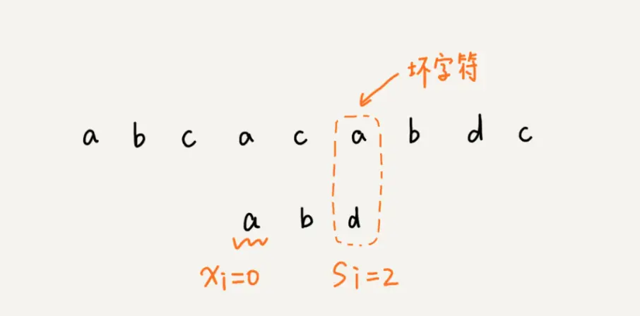 可以看到下图中,a就是主串中的坏字符,这时候把a对应模式串中的d对应的下标记为si,同时在模式串中发现坏字符a在模式串中的位置下标为Xi,则这个时候就可以把模式串向前移动Si-Xi位,例如图中移动的位置也就是2-0 = 2。