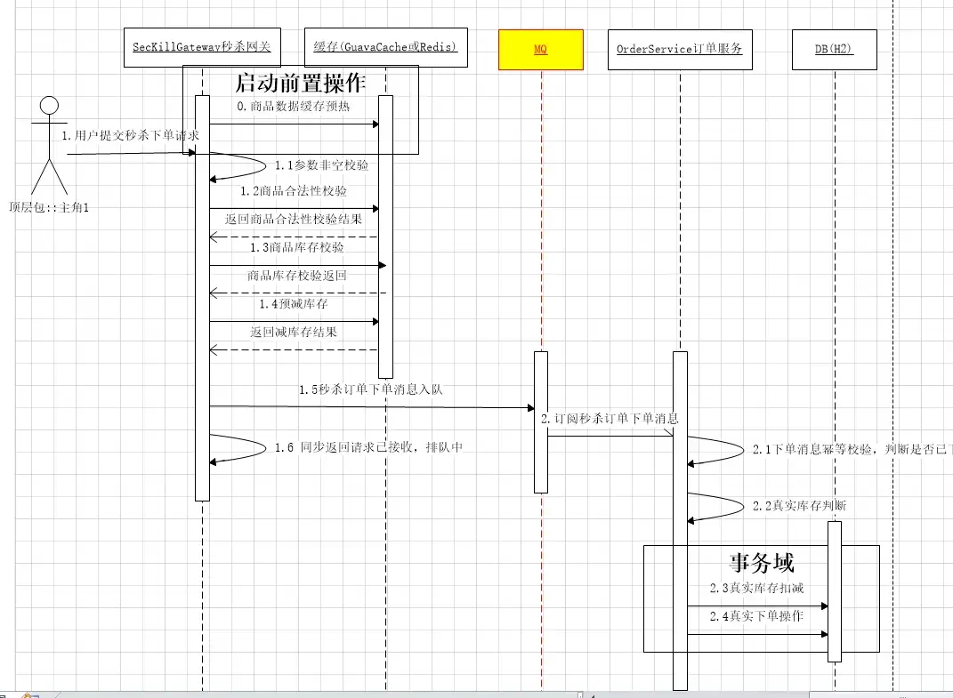 1:用户访问秒杀网关seckill-gateway-service,对感兴趣的商品发起秒杀操作。特别的,对于商品信息,在系统初始化的时候已经加载到seckill-gateway-service。在进行前置库存校验的时候,依据缓存已经做了一次用户下单流量的过滤。