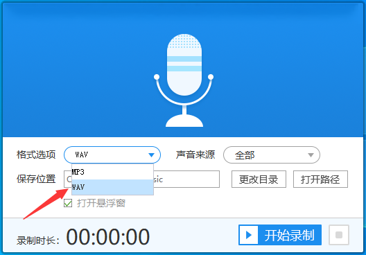 2、熟悉软件功能后可以先选择音频的格式,音频的格式分为mp3和wav两种,wav是无损格式因此对音质要求更高的可以选择输出wav格式。