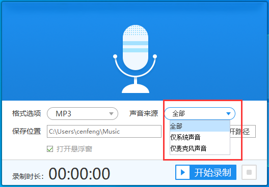 3、而录制之前你可以选择声音的来源,有全部(系统+麦克风)、仅系统声音和仅麦克风声音,根据需要选择其中的一种进行录制。